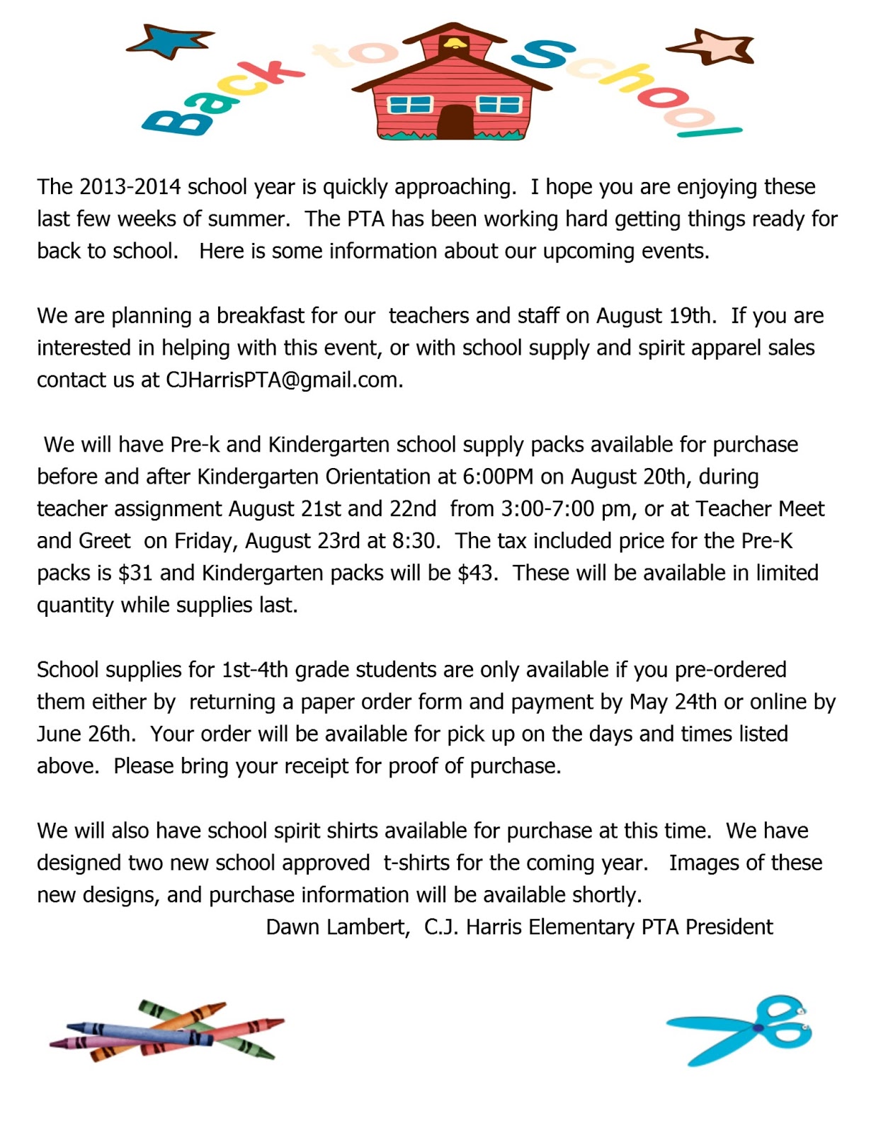 If you have a Kindergarten or Pre-K student, packs will be available for purchase at the school before and after Kindergarten Orientation on August 20th at 6PM. If you have any questions, contact me at CJHarrisPTA@gmail.com.Thanks,